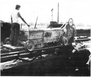The spreader rides on top of a steel track over a 100-ft. long bunk. A 1 1/2-hp electric motor mounted on back of the spreader is used to power the apron and beaters and to drive the spreader back and forth on the track. The operator stands on a wooden platform mounted on the front end of the spreader.