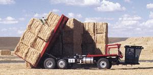 The rig handles eight 4 by 4 by 8-ft., twelve 3 by 4 by 8-ft. or 18 mid-size bales and features a front bale squeeze that snares bales slightly to the right of center, then lifts them onto a 9 1/2-ft. formed steel loading table. The loading table raises vertically to stack two bales on top of each other on the loading deck, which is equipped with a rolling rack to keep bales in place as it fills.