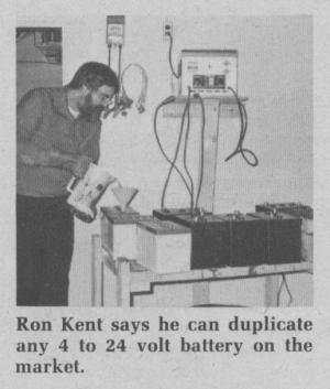 Kent makes and sells his batteries out of a main street shop he calls the Battery Barn. He uses the identical raw materials, casings and molds used by battery manufacturers and says he can duplicate any 4 to 24 volt battery on the market. "Some of my batteries are even better than comparable commercial units because I add extra plates for added storage capacity," says Kent.