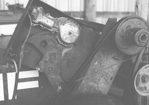 The bale thrower is belt-driven off the baler's flywheel. A cable pulls on an idler pulley on the belt. Allison mounted the window motor on the baler and attached it to the idler pulley cable.