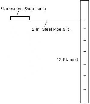 "They allow us to get light right over our work," he says. "I use 10-ft. posts anchored to studs with clamps so posts can swivel 180 degrees. I weld 6 ft. lengths of 2-in. dia. steel pipe to the top of the posts and mount standard 4-ft. long fluorescent shop lights on the end. The lights are wired with individual plugs so they can be used anywhere. They come in real handy and don't cost more than $35 or $40 in materials to build, including lights."