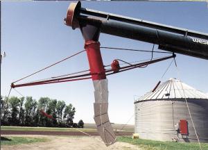 Controls for the winch mount at the base of the auger. Turning the winch one way or the other moves the flex spout back and forth. "It works slick and saves a lot of hassle," says Lindhorst. "I attached a rope to each end of the cross arm so I can swing it to line up with the truck or wagon. The spout doesn't slow down the auger at all. I welded a metal flapper on the shaft at the end of the auger to force grain down out of the spout."