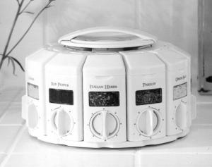 The Select-A-Spice carousel holds 12 spices in separate containers and dispenses 1/4 tsp. of spice at the push of a button. (Containers can also be removed from the unit to shake or pour spices). The unit mounts on a swivel base that rotates 360 degrees.