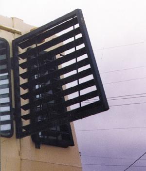 He first made a frame out of 1 1/4-in. square tubing to fit each window. The slats are made from 2-in. wide strap iron 1/8-in. thick. Two 3/8-in. dia. steel rods run through holes at each end of the slats. Stout welded the slats to the rods, tilting them at an angle. The holes in the slats are 1/2-in. dia., so there's enough play to tilt them to the proper angle. Stout notes that if you drilled larger holes in the slats, you could tilt them at a steeper angle.