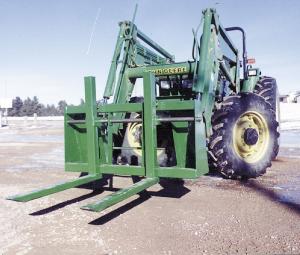 He used 10-in. channel iron and 3-in. sq., 1/4-in. thick steel tubing to build a rectangular frame that pins onto the loader arms. The frame's sides are made from 1/4-in. thick steel plate. The forks, made from 2 by 4-in., 1/4-in. thick tubing, are equipped with brackets that slide onto a rod made from 1 1/4-in. dia. solid steel. The rod is secured by two cotter pins. The forks can be positioned anywhere along the rod and are held in place by friction. He also made a pair of quick tach latches on back of the frame similar to the ones on the loader bucket.