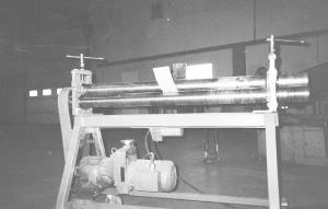 The unit is equipped with three 8-in. dia., 50-in. long steel rollers û two at the bottom that are chain-driven by a 2 hp electric motor, and one on top that can be adjusted up or down by turning a handle attached to a threaded rod at either end of the unit. The motor is equipped with a forward and reverse switch, allowing the two bottom rollers to be reversed. Three shorter rollers extend out one side of the unit. The two bottom ones are grooved which makes it easy to bend steel rods into a circle. The short rollers can be slipped on and off the shafts that support each roller.