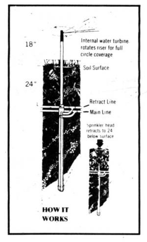 Each Agri-Pop sprinkler rests between cycles in a vertically buried housing equal to the length the sprinkler will have to travel through dirt to the surface and up to its desired sprinkling height. For instance, if you want the sprinkler to rise 4 ft. above the ground, and be buried 2 ft., each sprinkler pipe and underground housing will be 6 ft. long.