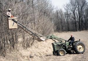 We have a lot of trees around many of our fields and often have to trim off overhanging limbs. Standing on a ladder or in a loader bucket while holding a chain saw can be dangerous and time consuming, so to solve the problem I built my own loader-mounted cherry picker. I use it on my Deere 2020 tractor. It consists of a treated plywood box that pivots at the end of a pair of 12-ft. long steel arms that bolt to steel brackets that wrap around the box. A pair of cross pieces connect the arms together. To keep the arms from bending I attach a pair of chains to the top cross piece and down to hooks welded on back of the bucket.