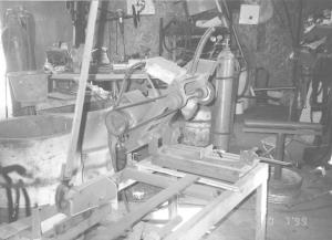 Home-Built Chop Saw WOODLOT EQUIPMENT Saws 24-2-39 Larry Miller, Spencer, Wis.: "I bought a Delta 14-in. chop saw which lasted less than 2 years before the motor burned out. I then rebuilt the saw at about 3/4 the cost of new only to have it burn out again 2 years later. At that point I decided to build my own. I built a frame and had a machine shop make a 1 1/4-in. arbor shaft for me. I had the bearings, 3 hp. motor, and switch. I used the vise and blade holder from the old chop saw. It's well-balanced and with plenty of power to cut through 1/2 by 3-in. steel bar faster lying flat than the old saw did with metal lying on edge. I use standard blades. No problems at all after 3 years. It runs at 3250 rpm's. The drive pulley is 6 5/8 in. dia. The driven pulley is 3 1/2 in. dia."
