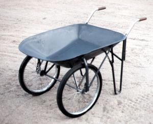 Wheelbarrow Built With Bike Wheels MISCELLANEOUS EQUIPMENT Miscellaneous 24-5-35 I love junk yards. I used to shop in town but now I get a lot of what I need at local salvage yards. Here's an example of something I built recently, entirely out of junk parts. It's a wheelbarrow with bike wheels. I found the shell of a wheelbarrow without handles or wheels, and fitted it with the big wheels and a framework off an old exercise machine. It's much easier to roll around than a regular wheelbarrow. (Roger Kuntz, 5251 County Road X, Grainfield, Kan. 67737)