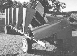 When Ronald Boehm bought a new Case-IH combine equipped with a 6-row corn header, he built a trailer to transport the header. However, he lives in an area with narrow and winding roads so he feldt the 9-ft. transport width was dangerous. His solution was to tip the snouts up and secure the tips in "pockets" welded onto a 12-ft. length of 5/8-in rebar. The rod rests in the channels on the header that support the dividers when they're in harvest position.