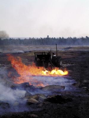 While a burner is operating in a field, Guptill stations other workers around the edge to watch for and control any fires that might get out of control.