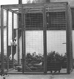 It gives cats a 6 by 6 by 6-ft. play area. Made of redwood covered by 2 by 3-in. galvanized wire, it's designed to mount against the house or barn. Three adjustable shelves are included. The size of the enclosure can be expanded by adding extra panels. Three panels are needed for each 2 ft. of length or for a fourth side.