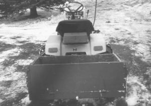 A homemade, 4-ft. wide angle iron bracket on back of the tractor supports a large wooden box that can be hydraulically tipped back to unload. The box measures 3 ft. wide and 30 in. long and has 2-ft. high sides. It has a tailgate on back.