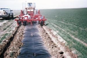 A brake on the unroller keeps the fabric tight as it unrolls onto the ground. Finally, heavy disc hillers on either side of the fabric throw soil on the edges to hold it in place.