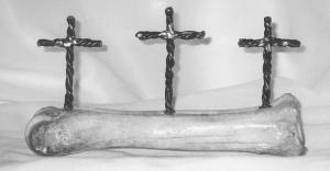 His favorite objects are crosses and figures. The pieces often contain up to 30 ft. of twisted or braided barbed wire. "I wear leather fencing gloves," he says. "I've worn out several pairs of gloves along with wire cutters." The finished pieces are left free-standing, mounted on walls, or even set on animal bones for display.