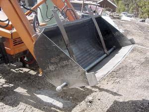 Fred cut a 1-in. dia. hole into each side of the back corners of the bucket. Then he cut a long leaf spring in half, leaving the shackle bolt holes on one end. A 1-in. dia. steel pipe was then inserted through the bucket as well as the shackle bolt holes on the leaf springs. Pipe caps hold the pipe in place.