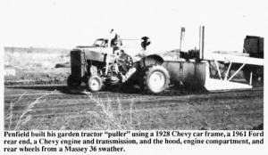 Penfield built his own garden tractor racer using a 1928 Chevy car frame, a 1%1 Ford rear end, a 1965 Chevy 4-speed transmission, a 1969 Chevy built4-cyl. engine taken from a Massey Ferguson 36 swather. "The hood, engine compartment and rear wheels were also part of the Massey 36 swather. The front wheels were salvaged from a Sund combine pickup."