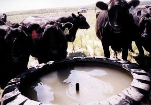 I've made improvements to the home-built floating paddle pump previously featured in FARM SHOW (Vol. 26, No. 6). The system uses the power of the flowing water to pump water from a creek to drinking troughs in adjacent pastures. It uses 12-ft. long, 12-in. dia. pvc pipes as pontoons. The flowing water powers a small piston pump that lifts water through a 1-in. dia. buried plastic pipe, lifting it 70 ft. and pushing it for a half mile or more to tanks in distant pastures. The tanks are made of old industrial tires mounted on concrete pads. At 1 1/2 gallons per minute, my paddle pump can easily supply 100 head. (Orrin Hart, Claresholm, Alberta)