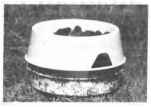 It saves food, reduces disease, and pre-vents stings on the nose or mouth of animal. The feed dish lifts off the base for cleaning or filling. Sells for $9.95 3-cup size, $14.95 16-cup size.