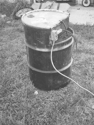 The barrel has a removable wash tray about 8 in. down from the barrel's lip. The tray sets on top of a clamp ring that he removed from the top of the barrel and welded to the barrel's sides. The pump is suspended about two thirds of the way down the barrel and plugs into a 110-volt outlet and switch box that mounts on the cut-away lid. The pump's electric line and washer hose runs up through a bunge hole in the cut-away lid. By removing two hinge pins, Lowe can remove the top lid in order to clean out the barrel. At the same time, the cut-away lid can be lifted off together with the pump, washer nozzle, and switch box.