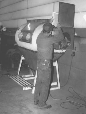 He cut out one end of the tank to make an access door and cut off the bottom of the tank to weld in a home-built metal hopper. A grate on top of the hopper serves as a table to work on and allows the sand to fall below for reuse.
