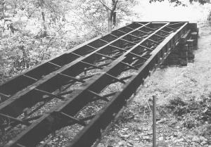 Footings at either end of the bridge consist of railroad ties laid log cabin-style from bedrock to above the creek bank. Ends of the ties were "pinned" with 1/2-in. rebar.