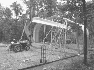Rose says the hardest part of putting up the building was lifting each of the twenty 2 by 30 ft. overlapping metal spans. "They're like wet noodles. When you start up with them, they go this way, that way, and every which way," he says. To handle them, Rose used his little Bolens 17 hp 4-WD diesel tractor and put a 4 by 4 on the front of the grill guard with a battery-powered winch on the back of it. A cable runs through a pulley at the top that hooks to the span and lifts it up. He built A-frames out of 2 by 4's and put a come-along on each corner to get each corner to come up at the same time. "Then, I had to continually climb on the tractor, off the tractor, and on the tractor again. That's the part that took most of the 10 days to do," he says.