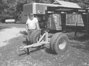 The Syracuse, Neb., man didn't want to use trucks to pull large trailers in the field. He took the wheels and axle from the back of a 750 Massey Harris combine and mounted them closer together. He made a drawbar hitch to pull it from scrap metal.