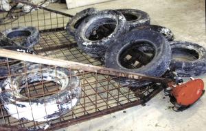 The tire picker measures 8 ft. sq. and is 3 ft. high at the back, with sloping sides. A 2-ft. section on front angles upward to keep tires from catching on the beater and kicking back. It also serves as a skid plate. There's an 8-ft. rotating shaft on the leading edge of the unit that's powered by a hydraulic motor. The shaft has 4 1/2-in. long steel spikes welded onto it on 6-in. spacings.