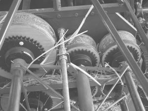The machine works a lot like a baler It picks up a windrow of straw and makes four cables out of it These four cables are dropped on the ground behind the machine Depending on the crop a clay-based binding material can be applied to the straw during this process to keep the individual pieces from sliding against each other In this case the cables then need to dry in the field for a day or two Some crops such as sunflowers or cotton don t require this application