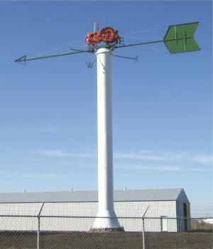 A 1942 Case Model D tractor equipped with scalloped steel wheels, sits on top of a 60-ft. steel tower. It's attached to a 55-ft.-long pointer, and framework that includes a large ball bearing. The "feather" at the back end is 8 ft. high and turns easily in the slightest breeze. The tractor points in the direction of the wind and the weather vane's directional pointers have magnetic north orientation.