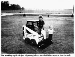 The 4-WD unit is patterned after the Bobcat model 743. It stands 351/2 in. high, 441/2 in. long, and 26 1/2 in. wide. It's just big enough for a small child to squeeze into the cab. Power is supplied by a 12-volt electric marine battery, with a pair of electric motors driving the four wheels which are fitted with 10-in. dia. tubeless tires.