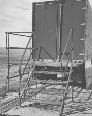 Christiansen Brothers Construction in Cherokee, Iowa, used lengths of strap iron and expanded metal to make steps, railing, and an unloading platform on back. The easy-to-setup folding platform has enough room to swing out the big doors on back, and to carry large work in and out of the trailer. There's also a door cut into the side of the trailer, and storage racks and large drawers hanging under the bed of the trailer.