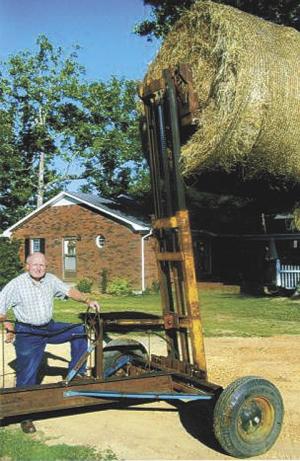 My 45 hp tractor was a little too small to handle a 6-ft. hay bale so I built this 2-wheeled bale hauler and stacker using a two-stage mast off a Hyster hydraulic forklift, an 8-ft. house trailer axle and wheels, and an old steel I-beam for the tongue.