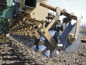Row crop farmers looking for a new method of handling strip-tillage, seedbed preparation, and fertilizer application at the same time have a new implement to consider. Mini-Warrior row units from Environmental Tillage Systems (ETS) of Faribault, Minn., use a single 20-in. 8-wave coulter to create zones 4 to 6 in. deep and 7 to 9 in. wide. Two 24-in. containment coulters trail the wavy coulter and roll the churning soil into a 2 to 4-in. high berm that's ready for planting within a few hours. Liquid or dry fertilizer can be placed in front of or behind the main coulter.