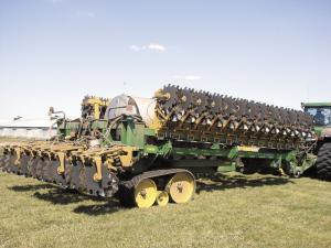 On a much larger scale, Mini-Warrior row units were used on a 36-row machine by Mike Hermanson of Story City, Iowa. Hermanson purchased a 60-ft. Houck bar built by Wil-Rich Manufacturing of Wahpeton, N. Dak. The huge folding rig has a 1,600-gal. liquid fertilizer tank and rides on 24-in. tracks. Hermanson mounted 34 Mini-Warrior row units on 20-in. centers, skipping two rows for the wheel tramlines. He pulled the rig with a Deere 9400T at speeds ranging from 7 to 9 mph.