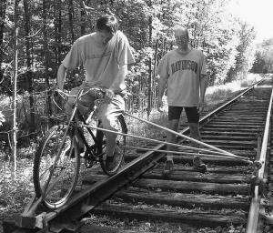 He suggests using a ladies bike for rail biking. They are easier to get on and off. He notes that when the bike is on a rail, it is 7 in. above the ground.