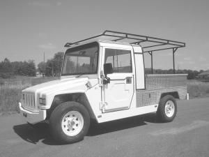 The truck's cargo deck is 71 by 58 in. Available options include removable glass windows, lockable rear storage unit, heater/defrost, CD player/radio, custom colors, and more.