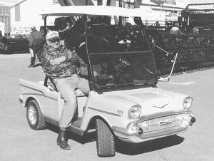 At the recent Big Iron Farm Show we found James Link of Jamestown, N. Dak., driving around with his friend Francis Gilles in a miniature 1957 Chevy car. Actually, the car was a fiberglass conversion kit that Link's sons installed on a Club Car golf cart. It comes complete with working headlights, taillights, and a hinged hood and trunk. It uses the golf cart's original seat, steering wheel, windshield, and roof.