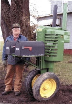 Ken Stonecipher, LaCrosse, Ind., took the front end of an old 1950 Deere G and made it into a new mailbox holder. He mounted it on a 4 by 6-in. piece of steel tubing with a 3-ft. square base welded to the bottom. The base is buried in the ground.