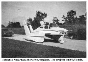 Wernicke's four-passenger Aircar would be powered by a 475 hp V8 race car engine. It would have a top airspeed of 266 mph. Air range would be 600 miles.