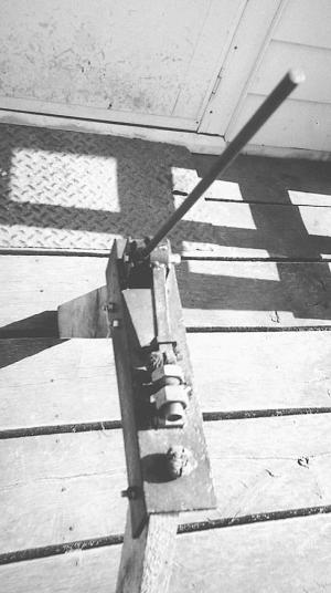 "It started out from a box of junk," Freymiller laughs. The base is 3-in. scrap iron, supported on 2 by 4-in. basswood legs. He rigged 1/2-in. sq. tubing, a grain binder bundle carrier tooth and a piece of a side rake axle to crack a nut against a 1 by 2-in. fine thread bolt.