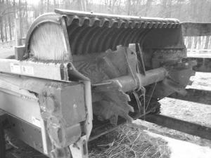 Adding a homemade deflector to his New Idea 3909 manure spreader helps Jesse Barley concentrate the spread of manure in the field and keeps it from kicking up in the air and blowing forward on windy days. Barley uses the modified spreader to form compost piles.