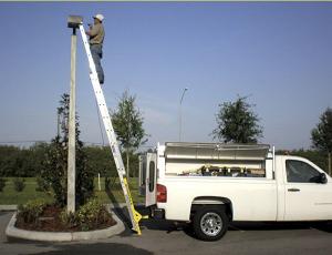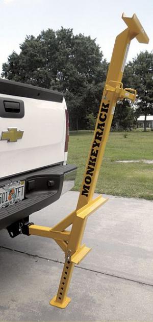 Monkeyrack is a ladder stabilizer that attaches to a standard 2-in. receiver hitch to hold a class 1A extension ladder. It lets the bottom of the ladder rest on the ground and supports up to 20 ft. of freestanding ladder height.