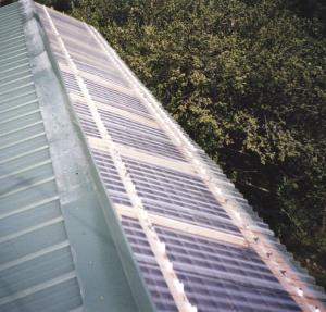 The home-built solar collector measures 4 by 30 ft. and is built right onto the roof. It consists of a plywood base overlaid with 2 by 4's. Plate glass from salvaged sliding doors lays over the 2 by 4's, which are notched on the bottom to accommodate ten 30-ft. sections of copper pipe that run across the collector. The pipes rest directly on the plywood.