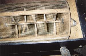 McCullough first made a 24 by 36-in. chicken wire drum with a 12 by 36-in., 18 gauge stainless steel access door suspended horizontally above it. They mount inside a 48 by 30 by 50-in. box with an oak frame covered by 3/4-in. plywood and a hinged door at the top. The drum is turned by a 1/6 hp gear reduction motor that McCullough salvaged from a job.