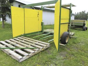 Simple Way To Handle Small Square Bales BALE HANDLING Conrad Keddie makes about 5 000 small square hay bales a year to feed horses He was tired of handling the bales twice – in the field and back at the barn He couldn’t justify the cost of an automatic bale wagon so he came up with a nifty new “palletizing” bale cart that leaves perfectly stacked piles of bales in the field on wood pallets Once bales are stacked on the pallets he never has to handle them by hand again Keddie’s “pallet” bale cart tows directly behind the baler It’s equipped with 4 forks and metal sides that wrap around a wood pallet that holds 40 bales He built the rig from the ground up “I wanted something that required at most one additional person because it can be difficult to hire a crew at baling time ” notes Keddie There’s a horizontal wooden platform running across the open front of the cart for the operator to stand on A sun shade over the top provides some comfort in hot weather A pair of swing-out doors on back are closed for loading Forks at the base of the cart are hydraulically raised or lowered A pair of extra pallets store on the sides of the cart The cart’s two fixed sides are slightly wider at the back and also at the bottom to make it easier to unload stacked pallets The forks that carry the pallet are attached to a common cross pipe with a hydraulic cylinder on each side to raise and lower the forks To operate one man stacks bales 4 high onto the pallet Once the stack is complete the baler stops Then the bale stacker manually opens the back doors lowers the pallet and the driver pulls away Two men then grab an empty pallet from alongside the cart lay it on the ground to be loaded onto the forks and then close the doors Later on a loader tractor equipped with bale forks is used to load the bale pallets onto trailers or wagons for the trip back to a storage shed “I’ve used it for 4 years and it works great Once bales are stacked onto the pallets the entire process is automated ” says Keddie “Having 2 empty pallets on the cart means I can usually make a full round in the field I stack empty pallets around the field and throw them onto the cart as I go by “In the evenings and mornings I haul the pallets of bales to my shed with two wagons one behind the other two pallets per wagon In the shed I double stack the bales staggering the top row so the top pallet straddles two lower pallets My Deere 4020 front-end loader with forks can comfortably handle the 2 000-lb plus loaded pallets Another big advantage of the pallets is that the bales are held off the ground allowing air to flow underneath ” Keddie used 2 by 6’s and 4 by 4’s to build the pallets “I built 100 pallets which is enough for 4 000 bales Customers usually return some of the pallets during the baling season so I always have enough on hand Occasionally a pallet gets damaged and has to be repaired but just about all my original pallets are still good If I was making 20 000 bales I probably wouldn’t use this system because it would require so many pallets it might not be practical “I found that 4 rows of 10 bales works best I build the stack from the back completing the fourth tier as soon as possible so I don’t have to reach over the top of bales to complete a row ” Keddie found that the forks weren’t strong enough to keep the tips up with a fully loaded pallet so he added a spreader bar and chain with a light chain hoist on back It holds up the tips of the forks and also holds the doors closed After building the cart he made one major change “At first I had a solid tongue with the bale cart more or less balanced on two main wheels but I found that during the bale loading process the cart pushed up or down on the baler so I added a single front caster wheel and moved the main wheels back ” says Keddie “The tongue now is hinged and only pulls and steers the cart which works better ” Keddie says if anyone is interested he has CAD drawings of the cart and pallets he could make available Contact: FARM SHOW Followup Conrad Keddie 14830 E Beaverly Road Prince George B C Canada V2N 6H1 ph 250 964-9315; conrad8@telus net