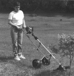 The Kwik Whip Cart is designed to accept most existing gas or electric-operated string trimmers. It rides on a pair of large cushioned wheels and has an L-shaped metal tube that the trimmer clamps onto at two different points. The clamp points have anti-vibration pads and adjust easily to different-size trimmers. It lets you trim under trees and other hard-to-reach places with less bending and stretching.