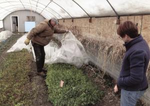 The Year-A-Round corn furnace is located in a big metal shed that’s adjacent to all 3 greenhouses. “We use the radiant floor system to heat the ground, not the air,” says Ann. “After the crop is up, we use row covers to hold heat down around the plants.”
